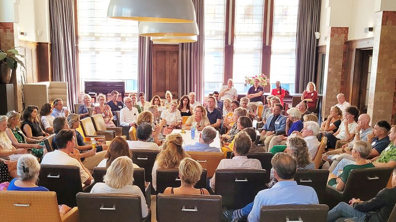 17.55 uur - Gelegenheid om olv een gids het gebouw van de Sociëteit beter te leren kennen zoals de geschiedenis, de architect, de ornamenten, de verglaasde tegels, de glas-in-loodvensters, de tegeltableaus en het bijzondere trappenhuis bestaande uit diverse stijlen met Art Deco en Berlage invloeden. Tevens is er een expositie van vijf kunstenaars, Manon Babtist, Sander van Walsum, Martine de Ruiter, Ruud Zweypfenning en Lottie Buit te bewonderen. Deze expositie zal tot en met de Kunstlijn in november te zien zijn.