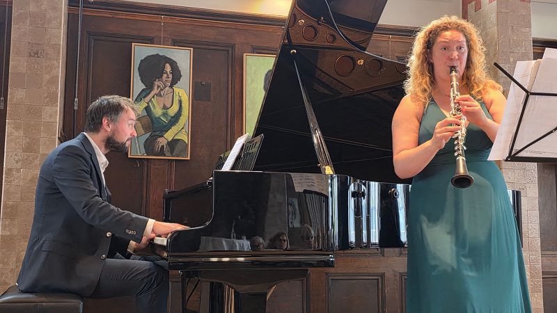 Op zondag 14 september 2025 werd na het zomerreces onze concertreeks weer opgepakt. De optredende musici waren Charlie Bo Meijering, piano en Heleen Oomen, klarinet. Op deze zonovergoten nazomerse dag mochten wij genieten van een volledig Frans programma, componisten Millaud, Poulenc, Saint-Saėns, Debussy en Widor. De beide musici zijn goed op elkaar ingespeeld, er werd met opvallend plezier gemusiceerd. Charlie Bo is o.a. bekend als vaste pianist van het TV-programma Maėstro. Charlie Bo mogen we onze vaste huispianist noemen, hij trad dit keer voor de zesde keer op in de Sociėteit.
