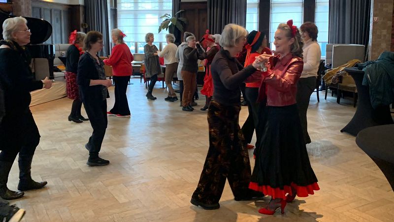 Meer dan 200 mensen - we zijn de tel kwijtgeraakt - wisten de weg naar de Societeit te vinden. En het bleek een gouden driehoek, de vrolijke sfeer die dansgroep Salsajoy met hun demonstratie wist op te roepen, afgewisseld met de prachtige band Jazzo en de presentatie en rondleiding door bestuurslid Henri door het historische gebouw. Mensen die voor Jazzo kwamen, pikten een rondleiding mee, mensen die voor de rondleiding kwamen, stonden een uur later te dansen bij Salsajoy en vice versa