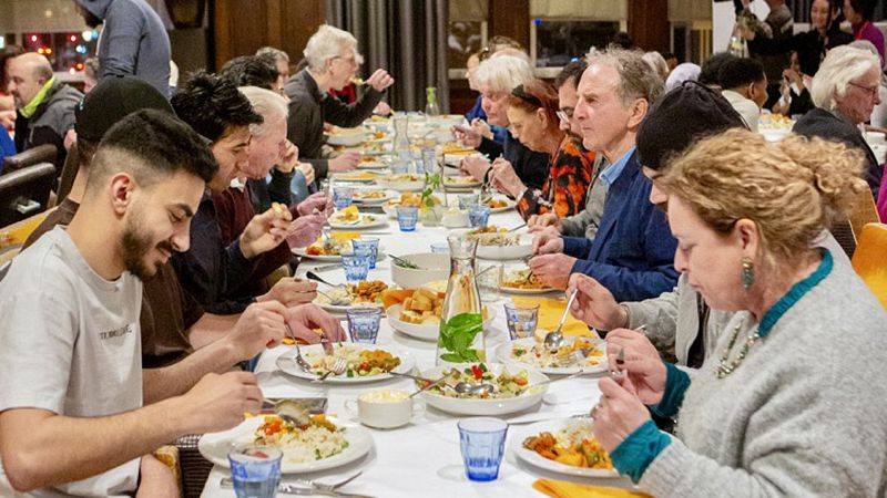 Tijdens het eerste Spaarnediner op 26 januari opende Sociëteit Vereeniging Haarlem haar monumentale zaal voor een bijzondere ontmoeting tussen Haarlemmers en azc-bewoners. Dankzij de grote gastvrijheid en actieve inzet van SO-leden en vrijwilligers uit Haarlem en Heemstede werd er samen gegeten en gedanst op livemuziek, een succesvol concept dat de organisatie heeft geleend van de Havendiners in Amsterdam.