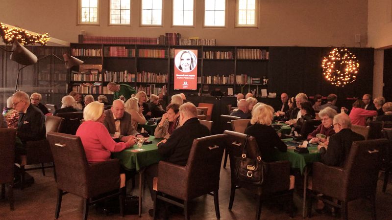 Traditioneel dragen die heren, die een smoking hebben deze bij de Kerstdrive, een prachtig gezicht. De dames zagen er ook erg feestelijk uit. Géén smoking? Dan wel feestelijk aangekleed, echt feest. Met 12 tafels verdeeld over 2 lijnen was het dringen in de bibliotheekruimte. Hans had er slapeloze nachten van en heeft allen uitgetekend en uitgeprobeerd. Paste het of paste het nèt? Bridgen in de bibliotheek was nodig omdat de clubzaal vol in de voorbereiding zat voor het Kerstdiner. Hier maar liefst 75 deelnemers (zie verslag Kerstdiner). Teken dat onze vereniging groeit en bloeit. Knus zo dicht op elkaar, maar lastig voor Rianne om door te komen met de drankjes. Er werd ondanks het dicht op elkaar zitten al met smart vooruit en omhoog gekeken. Komend jaar wordt het gebouw verder verduurzaamd wanneer het dak wordt geïsoleerd. Het monumentenglas gaf nog niet de gewenste behaaglijkheid.