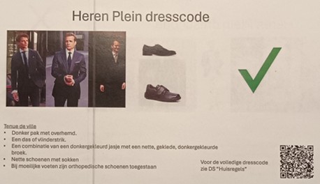 Resultaat: Dion en Nico mochten met de wedstrijdleider van De Witte achter een gordijn hun lunch nuttigen. Hieronder de dresscode voor de Heren (ook voor de dames bestaat er één). Ik hang een exemplaar op het magnetenbord bij de biljarts.